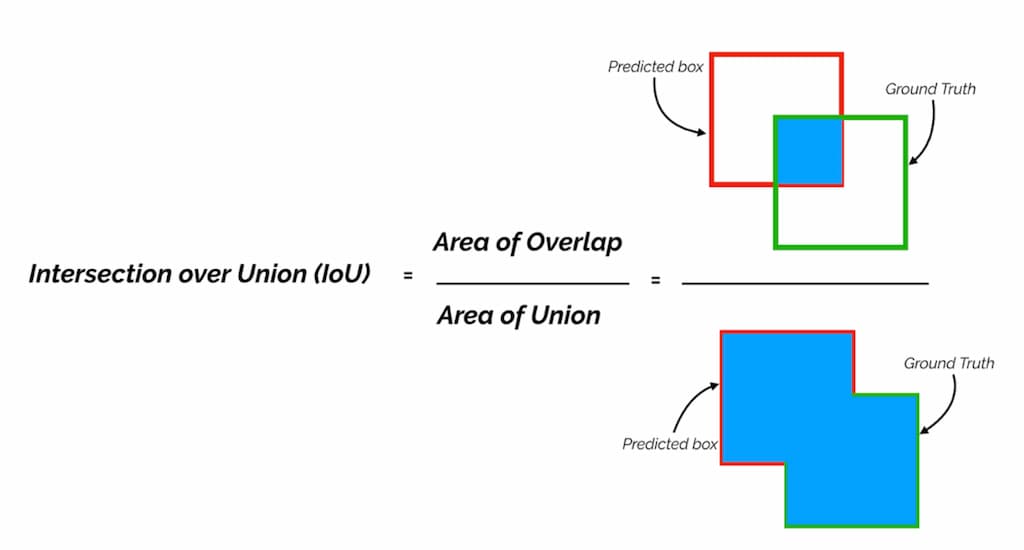 Para evaluar los modelos de detección de objetos, como el propuesto por el artículo de invertigación «Compare Object Detection Models From TorchVision«, los investigadores comparan las cajas delimitadoras que predicen con las cajas reales de nuestro conjunto de datos anotado. Si se superponen en gran medida, nuestro modelo está haciendo un buen trabajo. Esta métrica se llama «Intersección sobre Unión» o IoU.