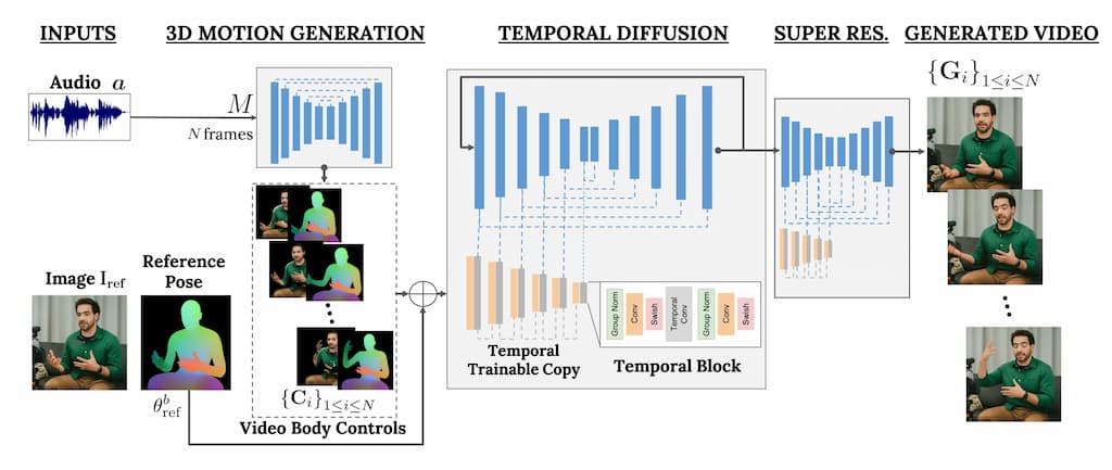 Generación de Controles de Movimiento es el primer acto de esta obra donde VLOGGER toma una entrada de audio y, como un director de orquesta, crea una sinfonía de movimientos corporales. La mirada, las expresiones, la postura, todo se sincroniza para dar vida a la imagen estática.