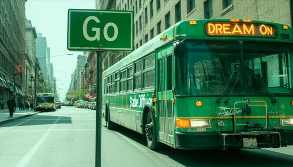 O tal vez un autobus verde con el letrero Dream On