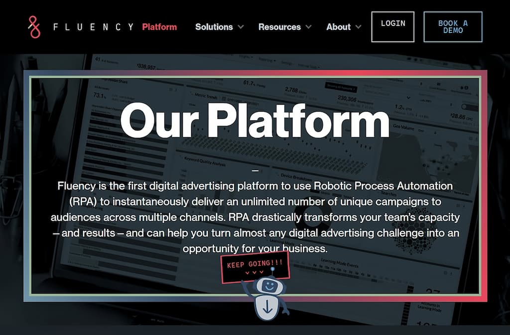 Fluency, una plataforma de automatización publicitaria empresarial, crea oportunidades de escala mediante «Blueprints», una función exclusiva de la plataforma. Los «Blueprints» son planes de estrategia publicitaria que utilizan datos para construir y aplicar cambios a cuentas publicitarias a gran escala 3.