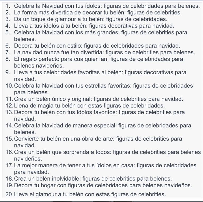“Escribe una lista con los mejores nombres o títulos para [FIGURAS NAVIDEÑAS DE CELEBRITIES PARA BELENES]. Deben ser llamativos, cortos y muy persuasivos.”
