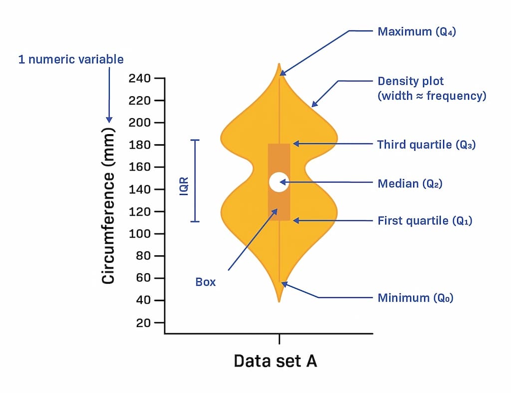 Imagina un gráfico de caja, pero con una capa adicional de información. Eso es lo que obtienes con un Violin plot. Este gráfico combina un box plot con un gráfico de densidad, lo que nos permite ver no solo la distribución, sino también la densidad de nuestros datos.